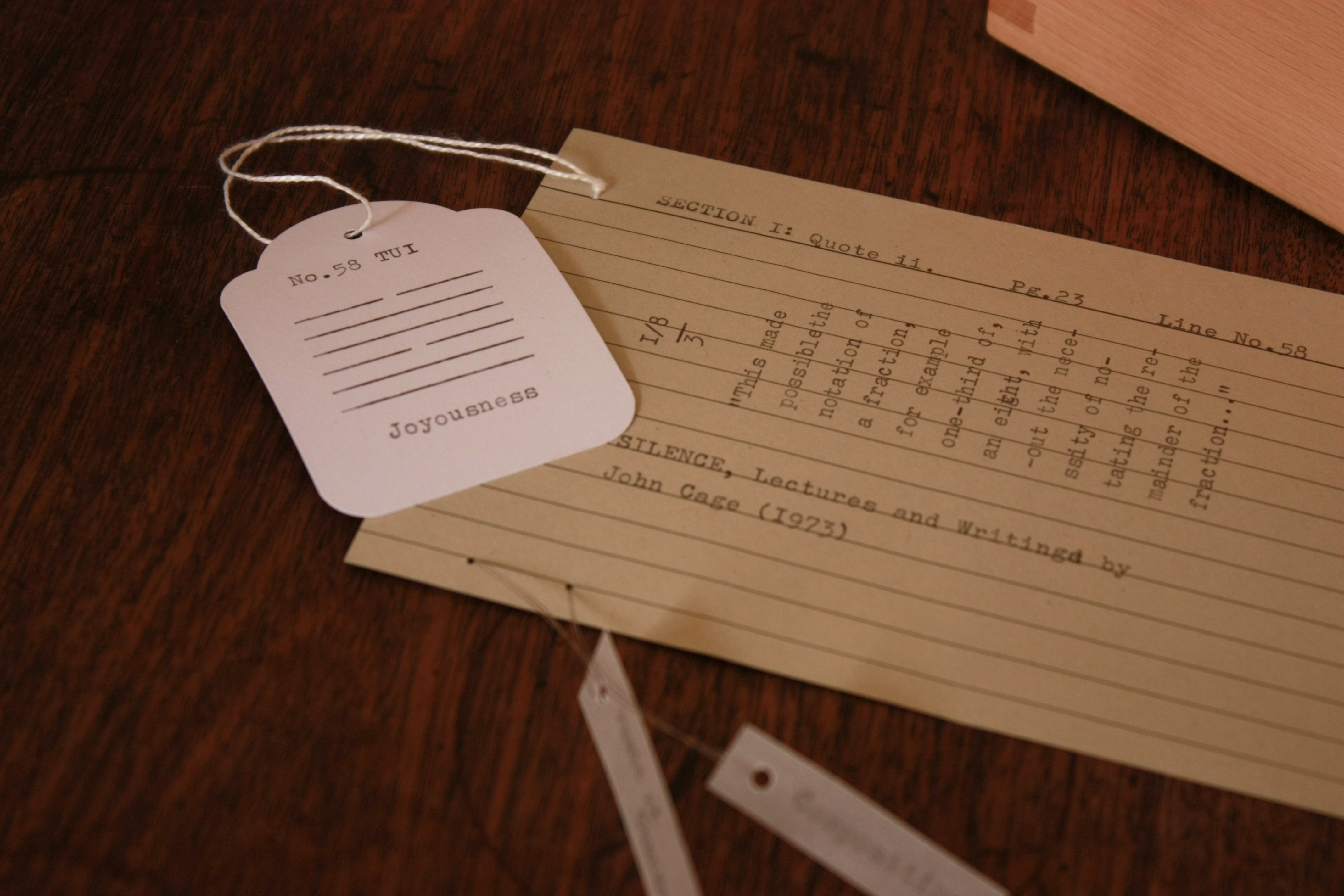 For this piece I’ve been working with the text SILENCE, Lectures and Writings by John Cage (1973), using the I Ching to generate an archive of random quotes. Recent work springs from an interest in chance and Buddhist ideas of interconnectedness and intersubjectivity. Exploring these ideas I am drawn to John Cage’s use of chance procedures and instructional scores, which allowed performers to be independent yet part of open-ended, multi-faceted performance events.